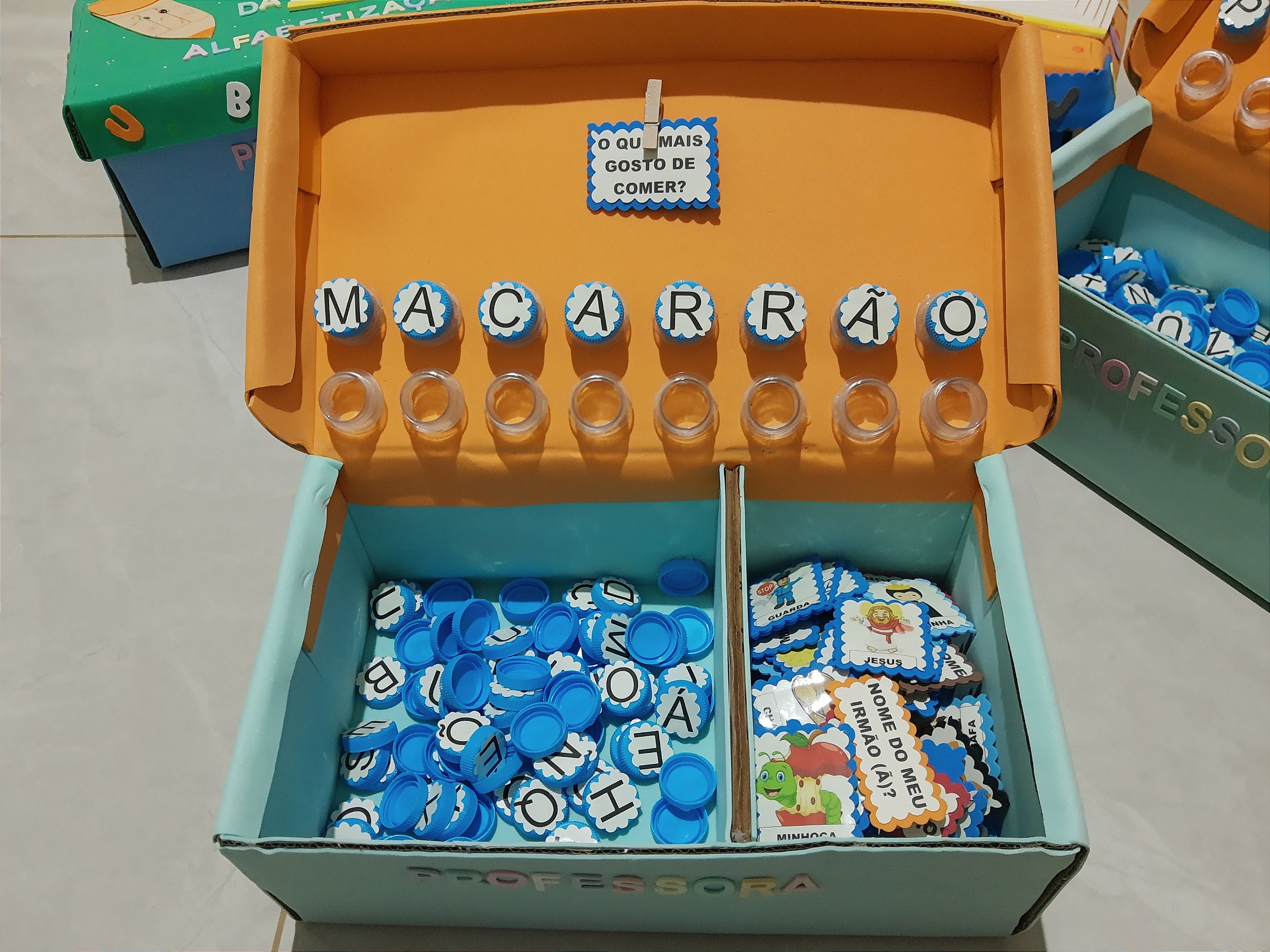 Os alfabetos são impressos e colados nas tampinhas..