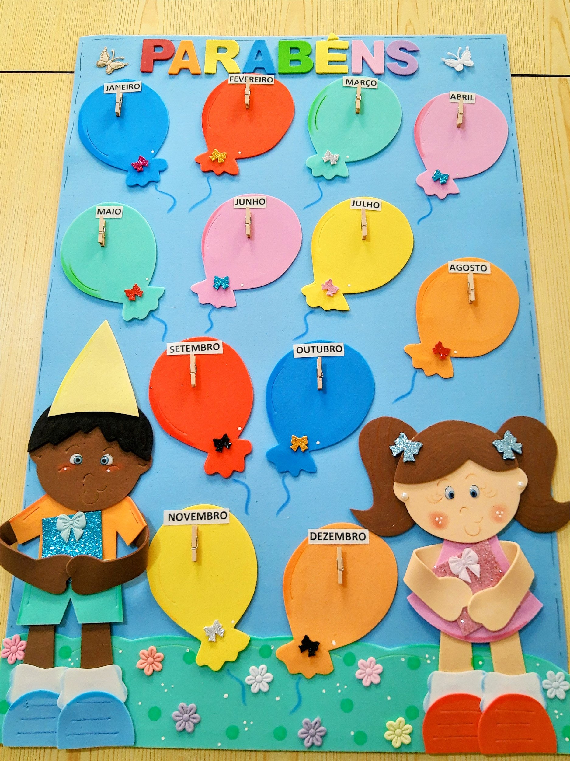 Possui 12 balões com nome dos meses e 1 mini prendedor em cada balão.
