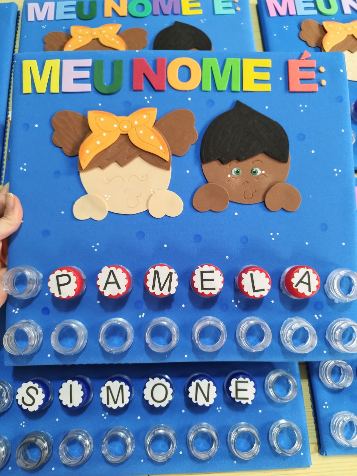 (As letras são coladas em tampinhas de garrafa).
